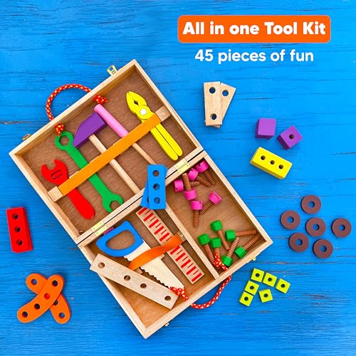 - IGNITE CREATIVITY WITH KIDS TOYS FOR 2 – 5 YEARS BOY: Kids toys for 2 – 5 years boy just got more exciting with this 45-piece wooden tool kit! Watch your child build helicopters or castles while learning screws, nuts, and bolts hands-on.