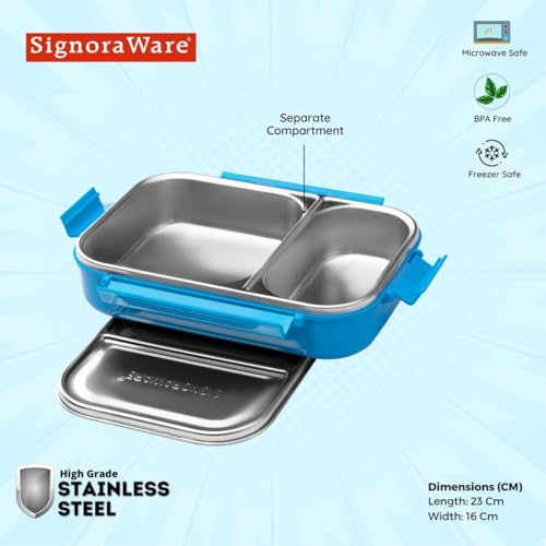 - Best Usage: The Signoraware lunch box is perfect for carrying a variety of meals, from school lunches and work breaks to picnics and outdoor adventures. With two separate compartments, it is ideal for portion control and special diet needs. Its compact and sleek design makes it easy to transport while keeping food separate and fresh.