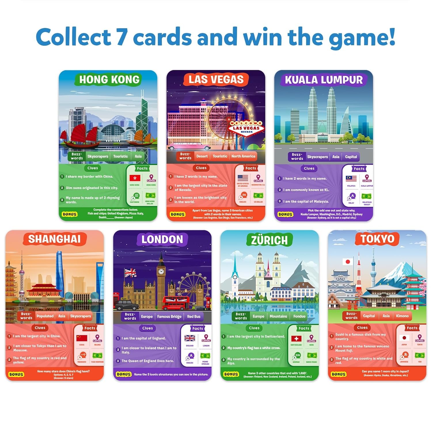 STRATEGISE TO WIN!: Make use of exciting features such as Clue Cards and Bonus Questions to plan your way to winning 7 cards.