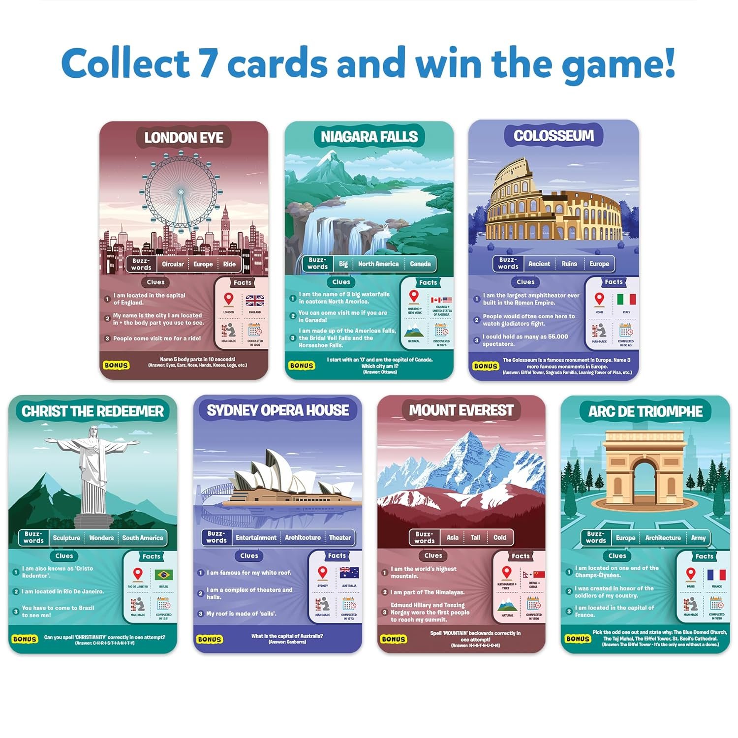 ULTIMATE GUESSING GAME: Divide yourselves up in teams, or play one on one, ask up to 10 questions to guess the legendary landmark on the Game Card! Is it one of the Wonders of the World? Does it have a dome? Is it in Asia? Think hard, ask intelligent questions, use your clue cards wisely, and be the first player to win 7 Game Cards!