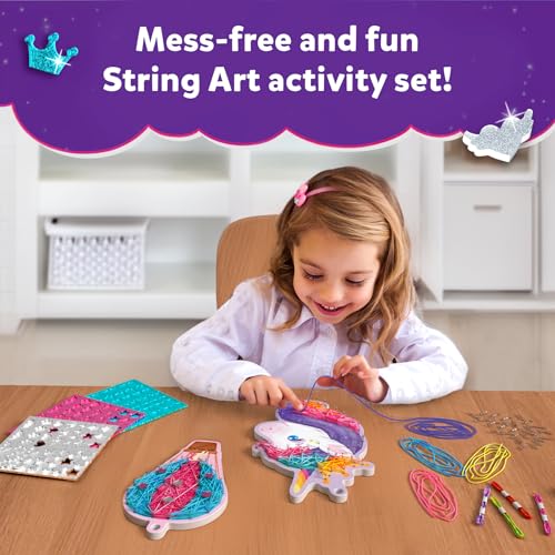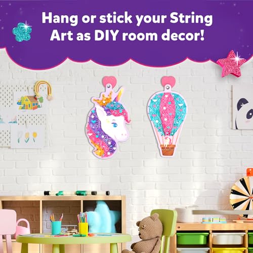 - MAGICAL STRING ART ACTIVITY: This mess-free, fun, and easy craft activity encourages creativity! Kids can create magical pictures of a unicorn, a hot air balloon, and a colourful rainbow. Just snap the pins into the pre-punched holes, twirl colourful, shiny strings around them, and dazzle up your pictures with foam stickers.