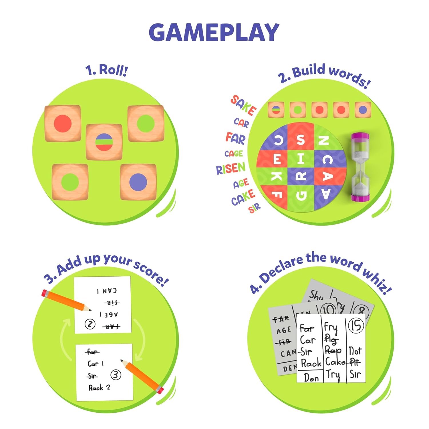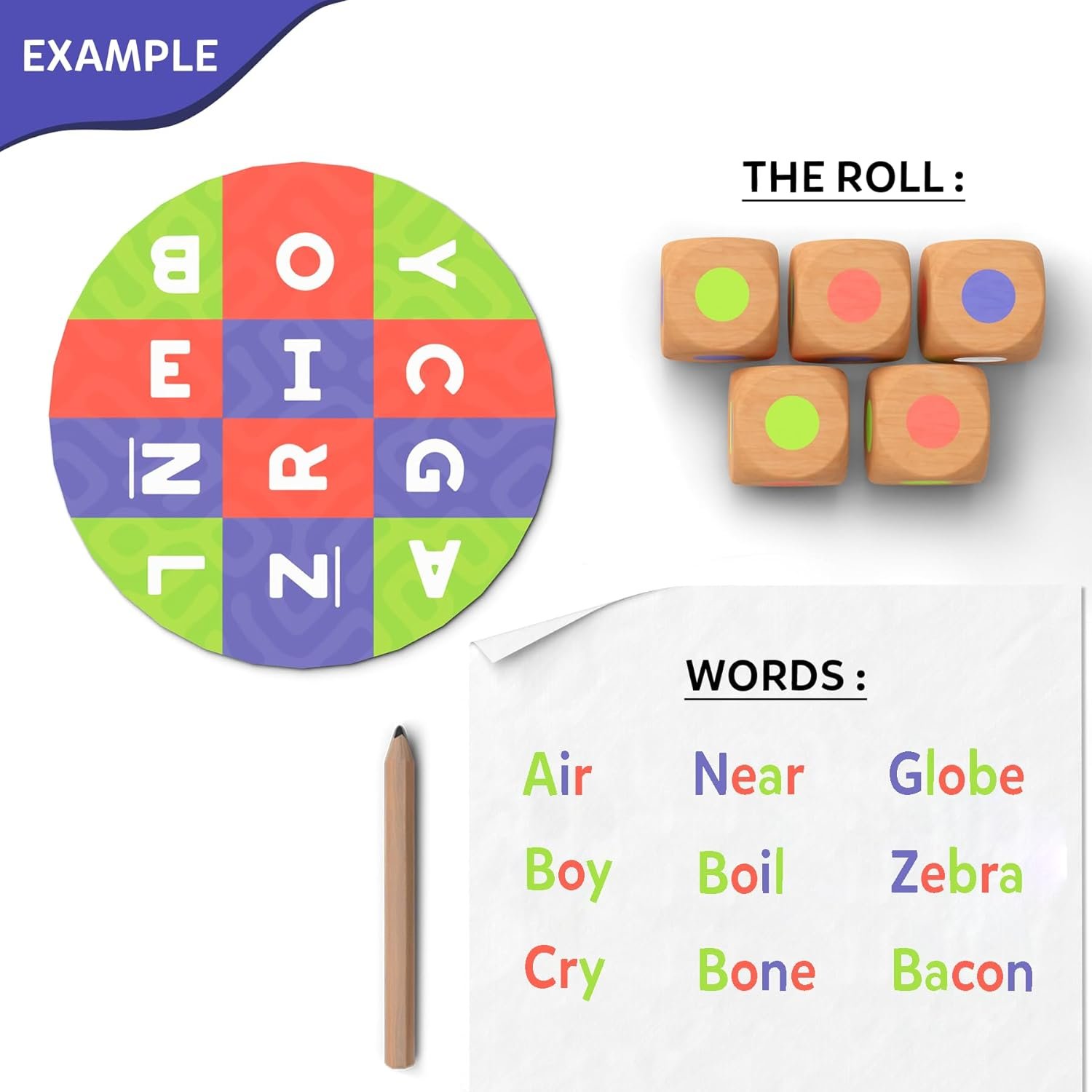 GAMEPLAY: Begin by placing all the game cards face down in the center and then turn one card over from the top of the pile. Roll the wooden dice and rearrange the letters to create words that match the colour combination of the dice. Players can spell 3, 4, and 5 letters words. Create as many words as you can before the timer runs out. The player with the highest number of unique words wins the round!
