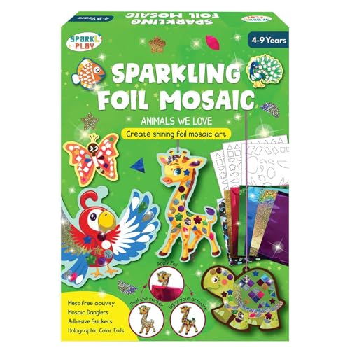 SparkLPlay Art and Craft kit. Toys for Kids. Foil Fun Activity. Birthday Gift for Girls & Boys Ages 4 to 9. Theme Danglers 6, Color Foils 40+, Stickers 190+. Foil Mosaic Craft. (Animals We Love)