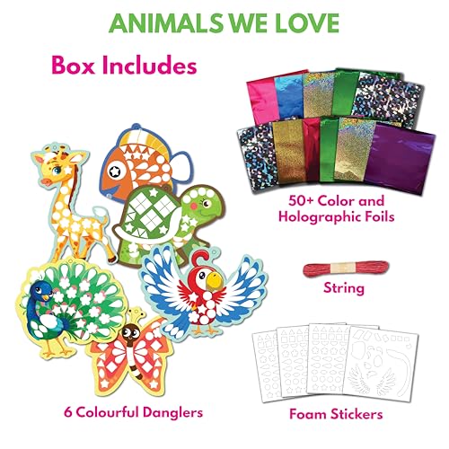 - Box Includes: This complete craft kit includes 1) 40+ Colour foil sheets 2) 6 Animal Theme danglers 3) 190+ Adhesive foam stickers 4) Art Craft Paper string. Child safe material.