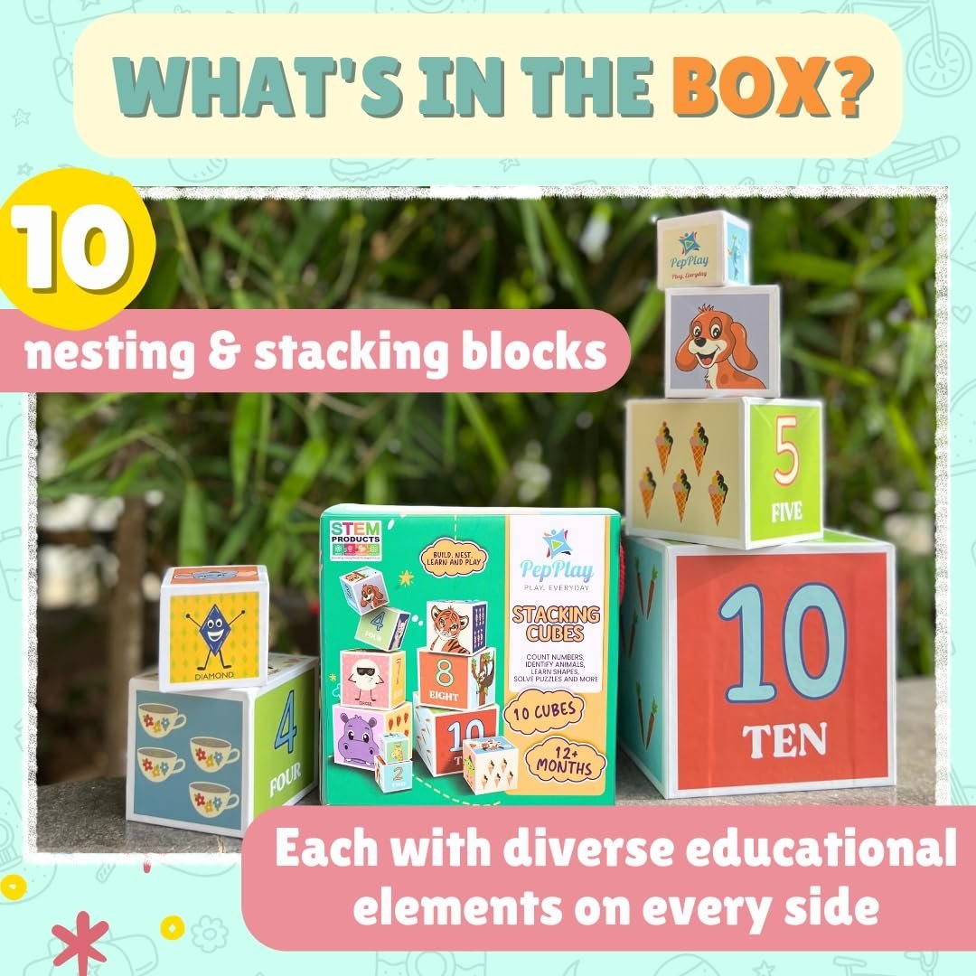 Introducing Pepplay Stacking & Nesting Cubes, the perfect tool for early learning that combines fun, creativity, and education in one set. These 10 colorful and sturdy stackable/nestable cardboard blocks are perfect montessori toy for 1+ years.. Each block helps kids lean about Animals, Shapes, Numbers, Counting, Colors, and even a puzzle in the form of a growing tree, making learning a truly engaging experience. A perfect gift for toys for 1+ years old