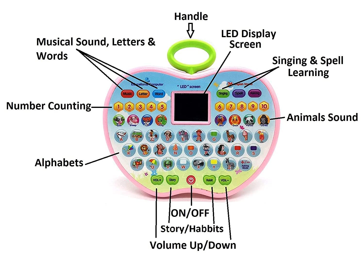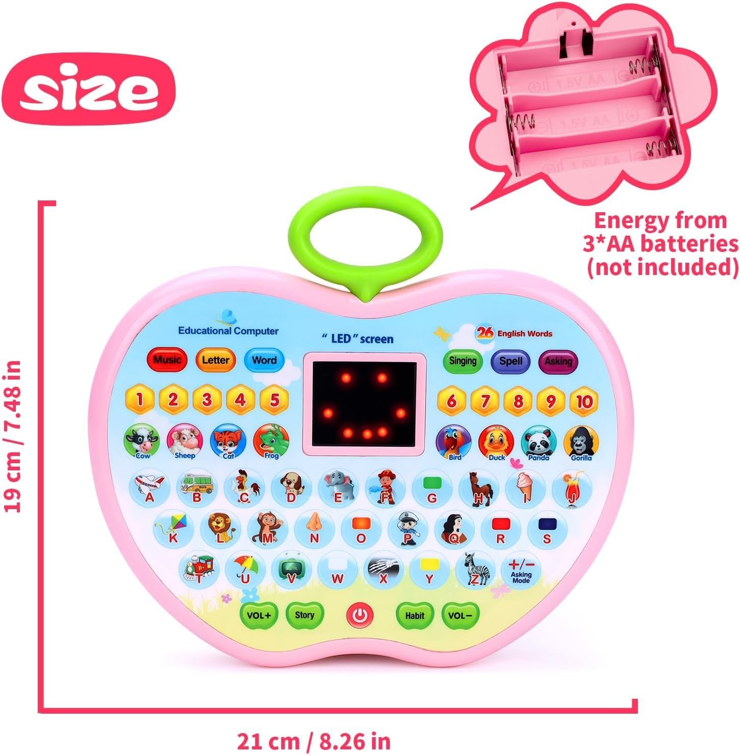 👍EXCLUSIVE DESIGN FOR KDIS👍:The cute apple design can arouse the interest of boy girl kid aged 1-3 in learning,It is a good educational toy for toddler aged 1-3. The LED screen design allows kid to get Interactive while learning, and it is an interactive electronic toy. The learning tablet needs three AA batteries (not included) and can be used for a long time. The battery cover is fixed with screws, so it can be used by 1 2 3 kids with confidence.