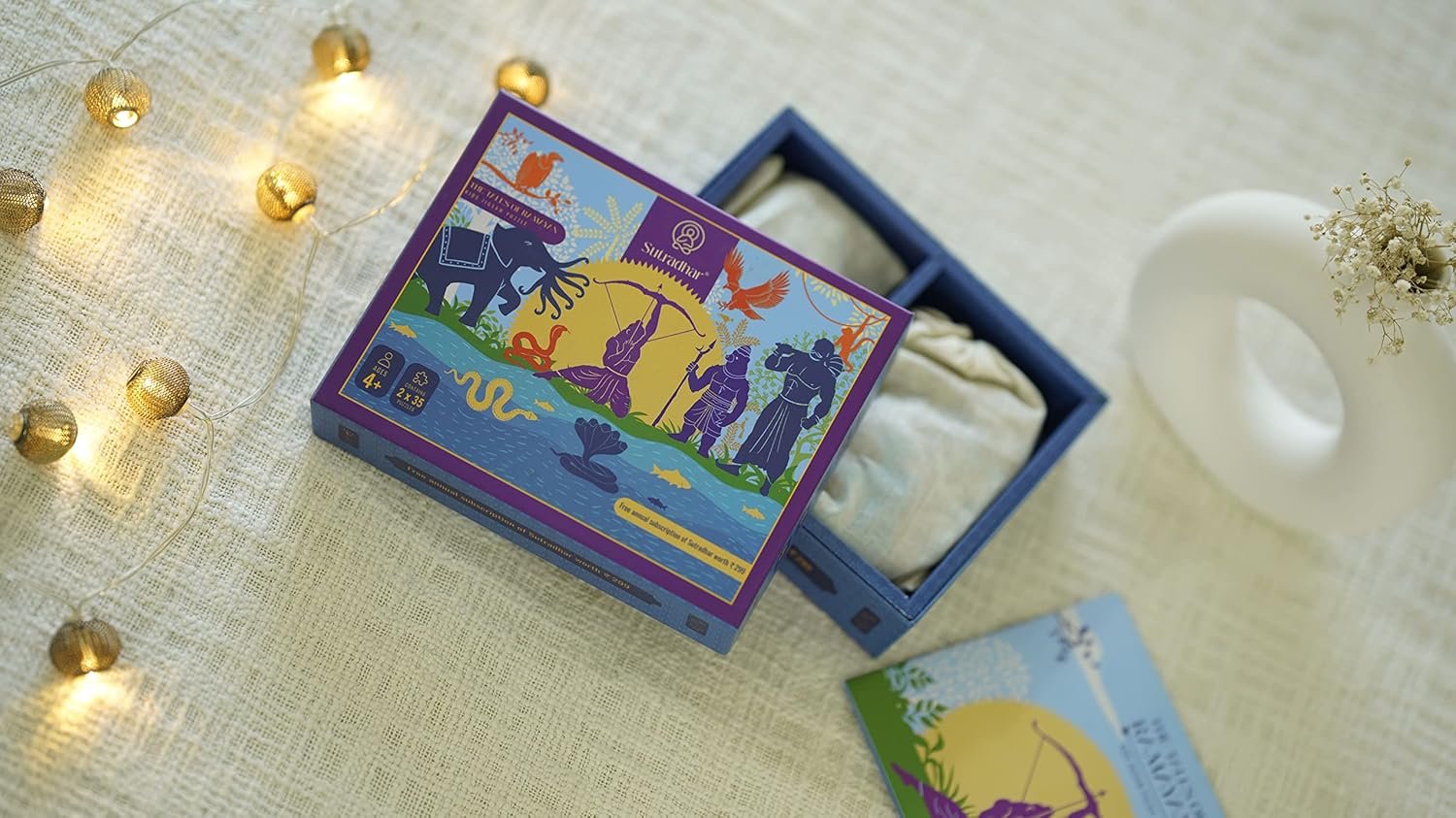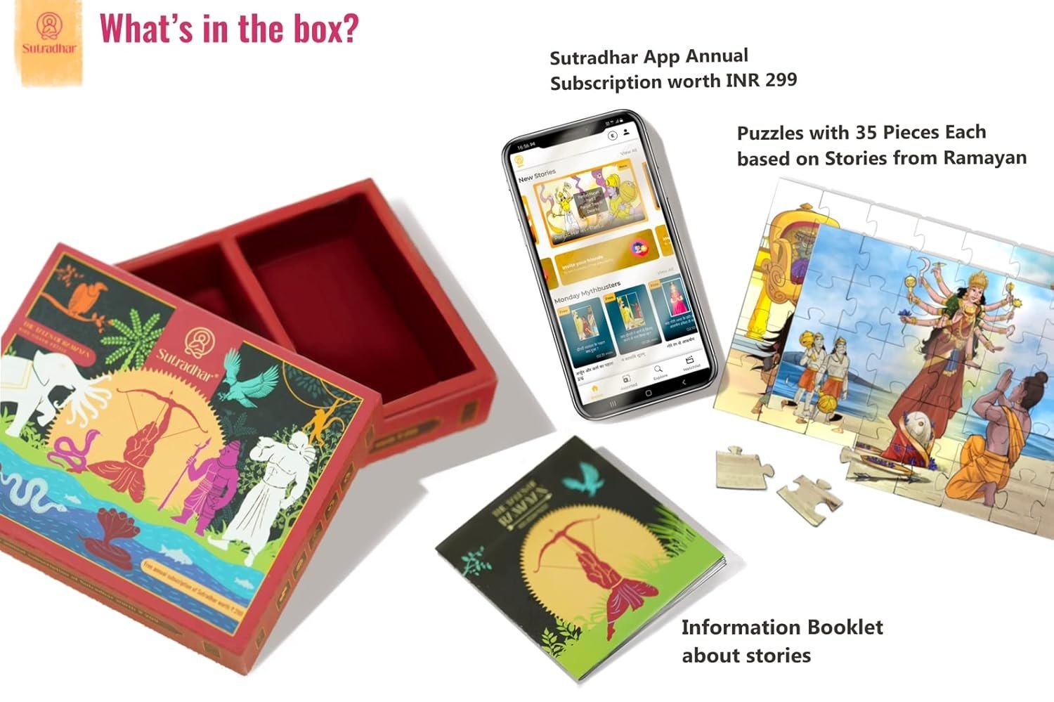 STORY BASED PUZZLES: Puzzles are from stories from RAMAYANA. This story-based cardboard jigsaw puzzle for kids has 2 puzzles with 35 pieces each that come in a sturdy premium cardboard box for easy transport and storage. After the completion of the puzzle kids can watch the full story and its moral on the Sutradhar app. This makes the whole process more interesting and interactive.
