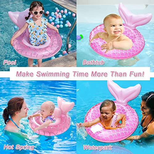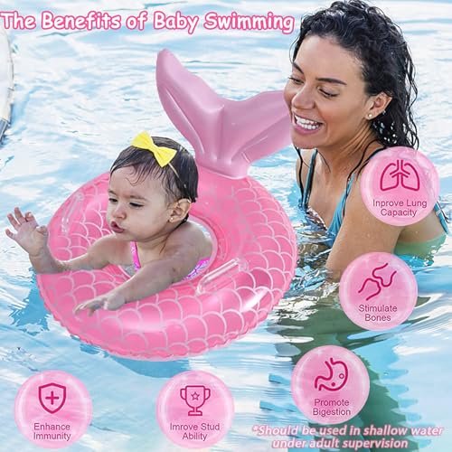 - ??Falling in Love with Swimming? The inflatable baby swimming float with seat and cushion is perfect for babies to learn swimming and play in the water in summer. You can use it in the swimming pool or bathtub. Safe swimming rings stimulate babies' early learning and growth, making them enjoy swimming from an early age and training their body coordination skills. A summer toy swimming pool toy suitable for swimming pools, bathtubs, and beaches. The beautiful mermaid shape will attract your baby to enjoy the water