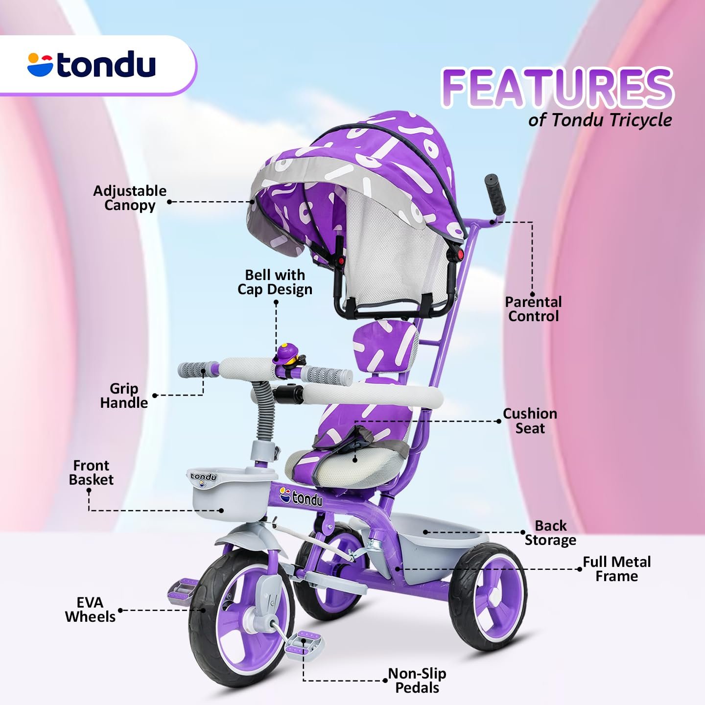 TONDU Tricycles for Kids with Canopy Seat Belt | Storage Basket | Baby Cycle for 1.5 to 4 Years Boy & Girl Tricycle (Purple)