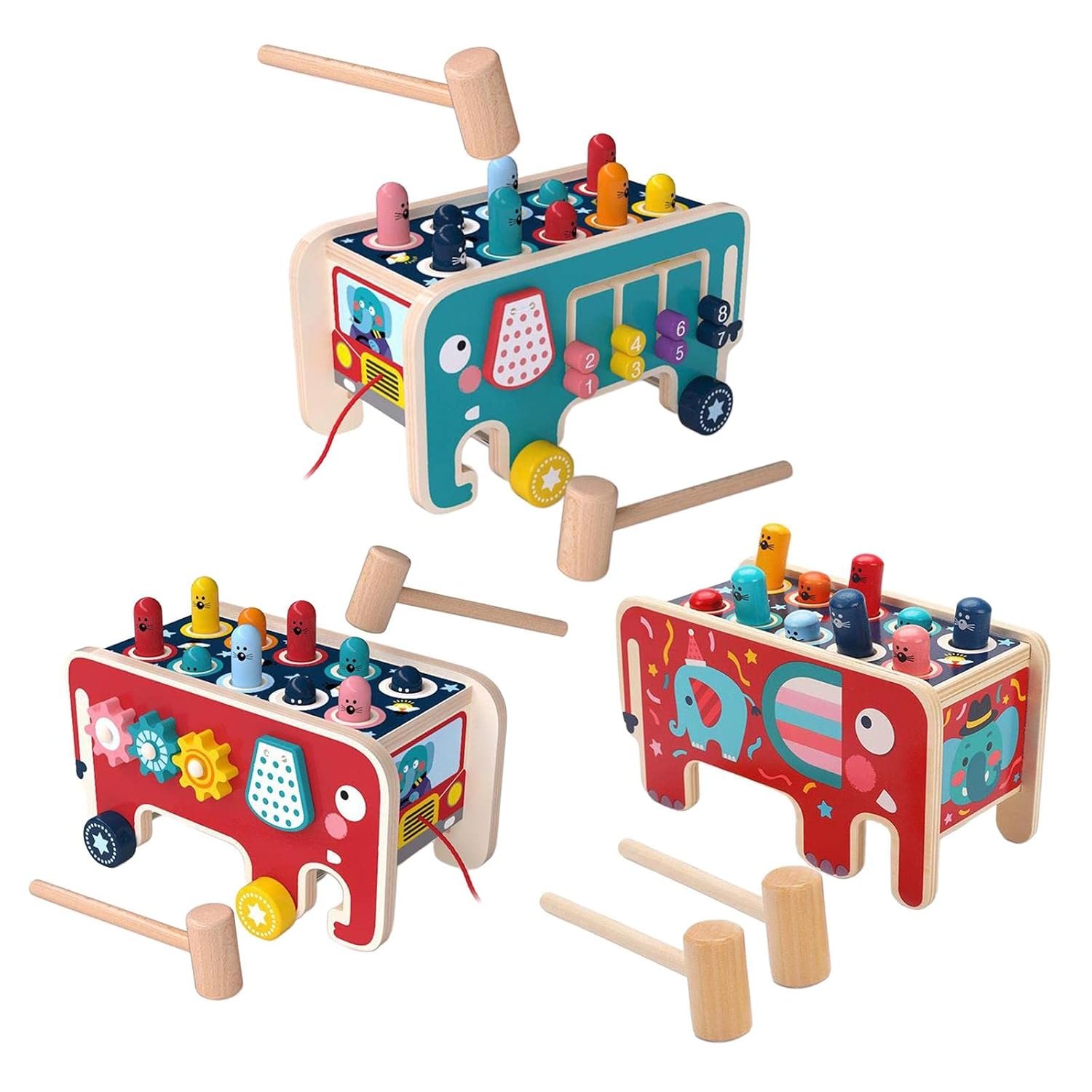 Double Mallet Design For The Baby To Beat The Colorful Pegs Down Through The Holes With 2 Hands.