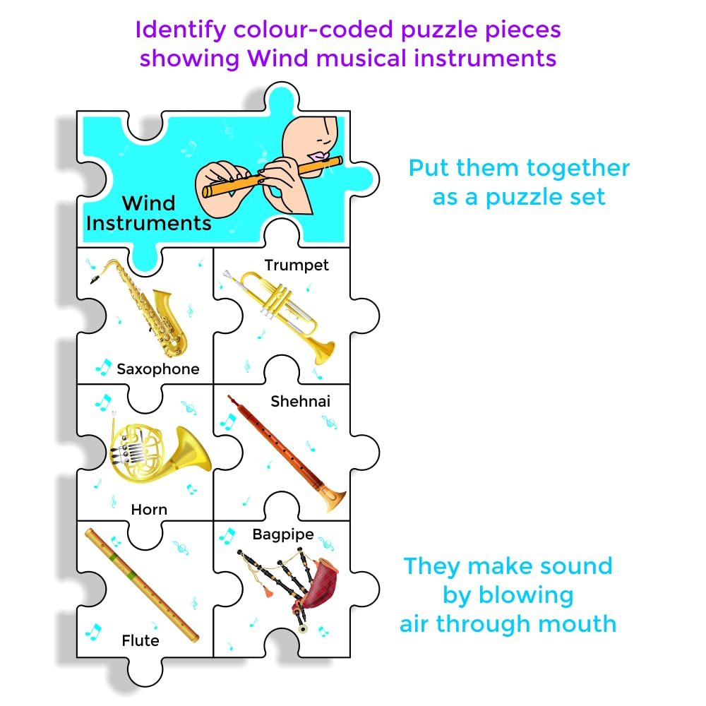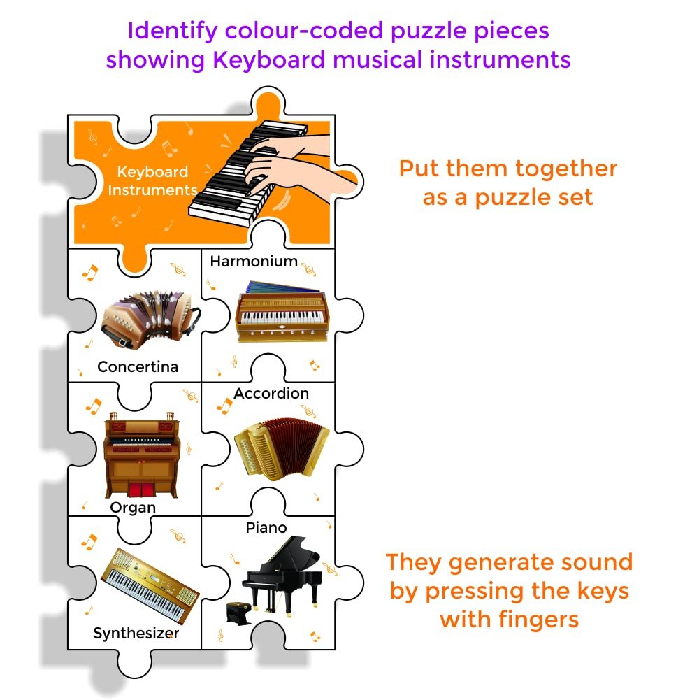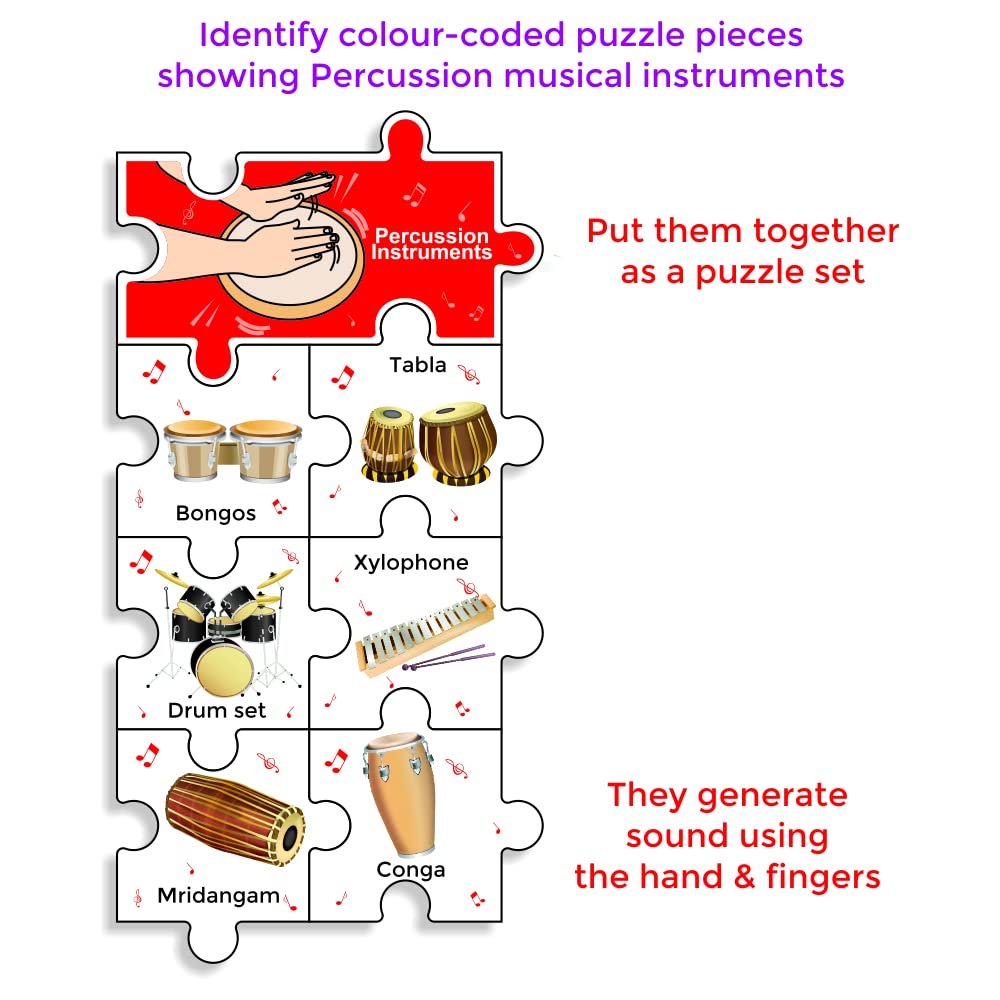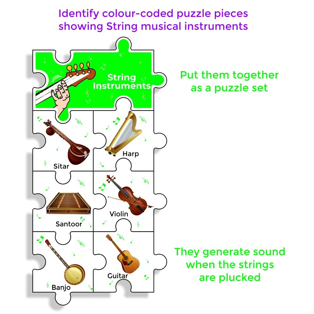 All the puzzle pieces of the musical instruments are of the same size, have common jigsaw edges and are coded with coloured musical notes. By colour matching, the child joins the appropriate jigsaw pieces for 6 instruments with the music instrument category piece such as String, Wind, Keyboard or Percussion instrument