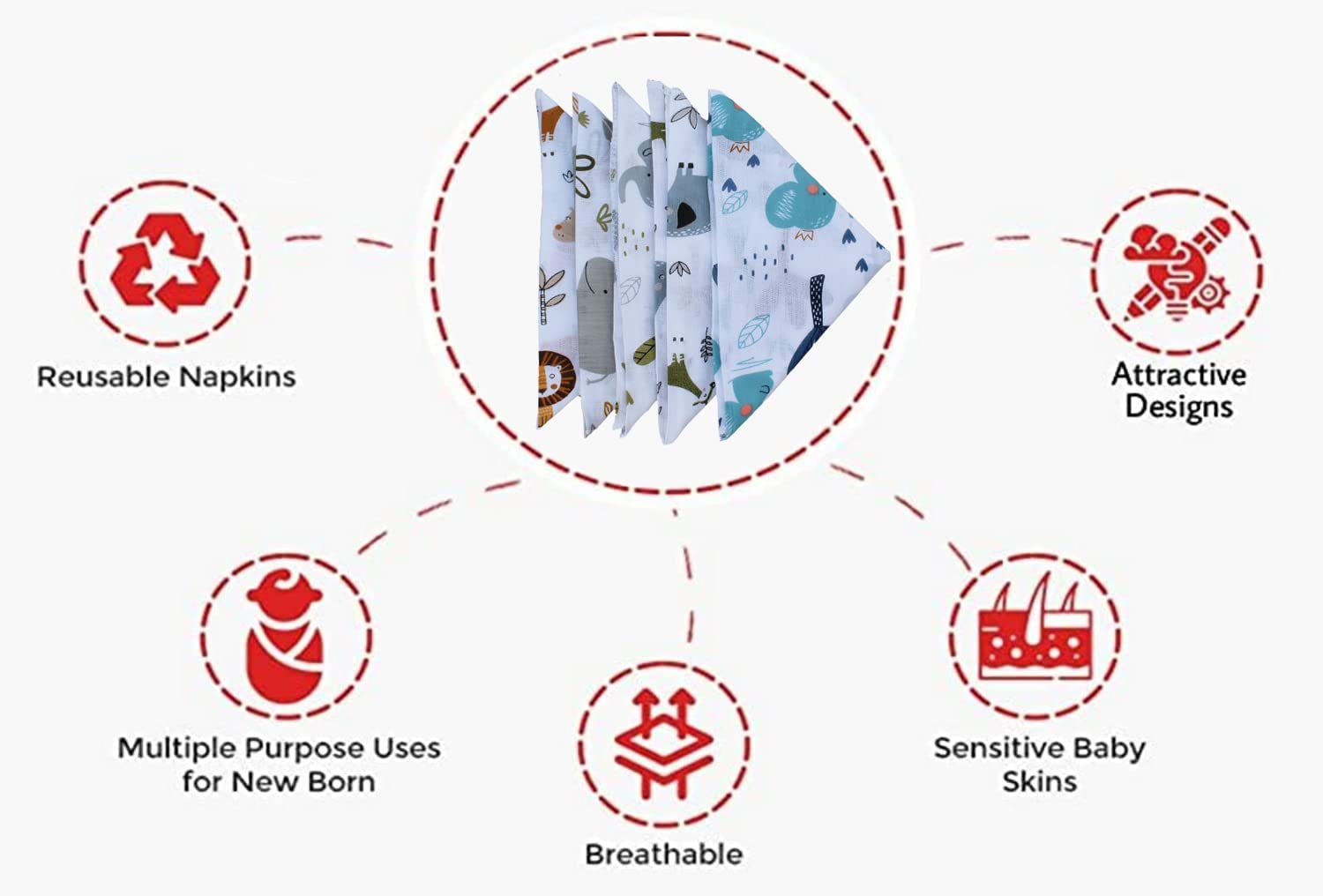 Made from Super soft Malmal Fabric , which is 100% Cotton. These are Smooth and soft | Breathable | and Comfortable for Sensitive Baby Skins.Multiple Purpose Uses for New Born /Babies as a Cleaning / hygiene cloth / feeding cover /wash cloth and more