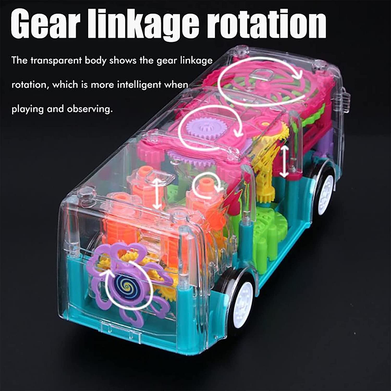 Transparent 3D Bus Toy, 360 Degree Rotation, Gear Simulation Mechanical Sound and Light, DIY Customizable Miniature Bus Playset for Kids 2-5 Years