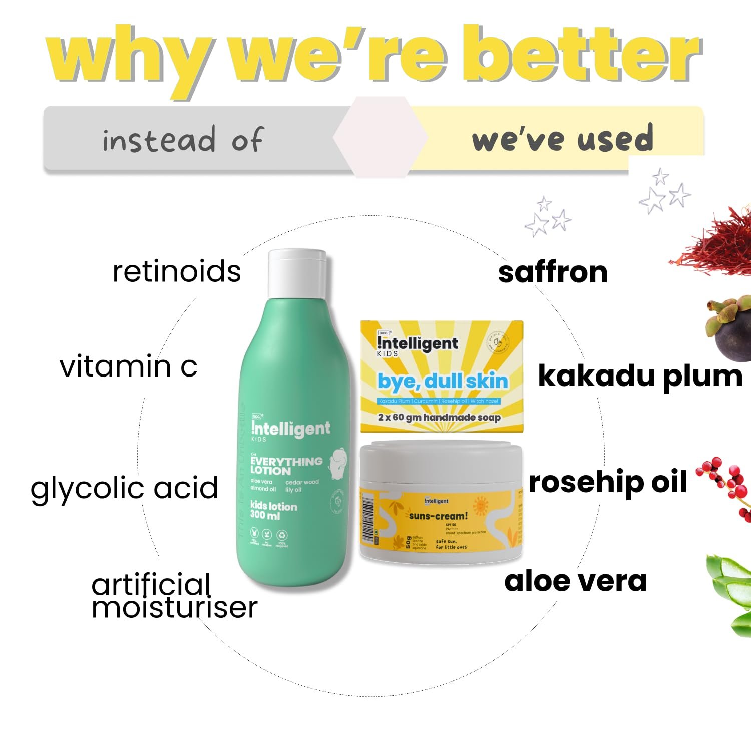 A complete skincare solution for kids aged 3-15, specially crafted for Indian dull skin. It includes a Dull Skin Soap, a lotion, and SPF 30 face cream + sunscreen