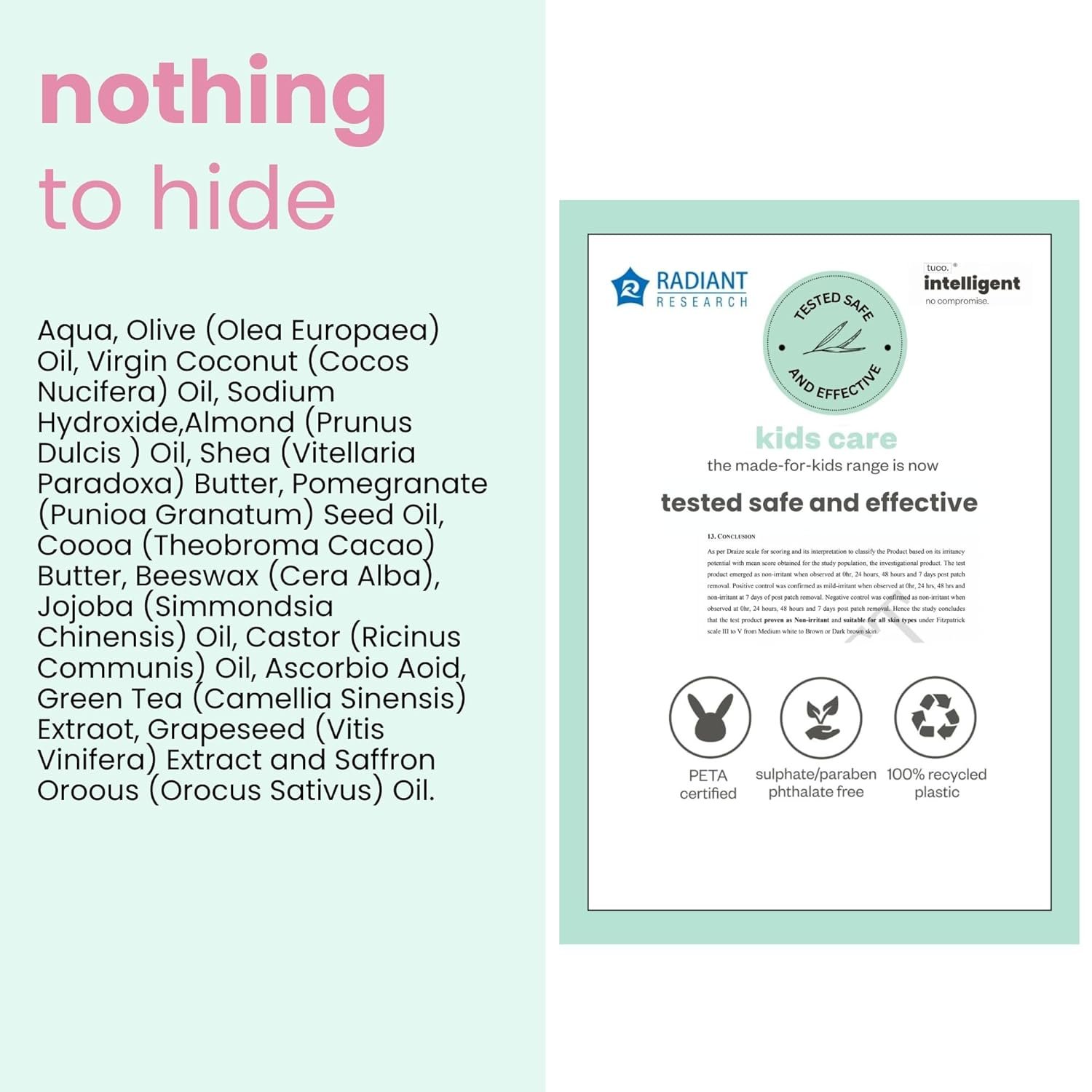 Natural Ingredients: We use only natural, plant-based ingredients, ensuring a gentle and effective cleansing experience for your child\’s skin.