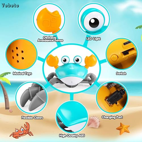 VEBETO Musical Crawling Crab Toy (1 Year Warranty) Walking Moving Toys Obstacle Avoid Sensor Interactive Dancing LED Lights Music Baby Kids Infant Toddler Tummy Time Electric Educational Rechargeable