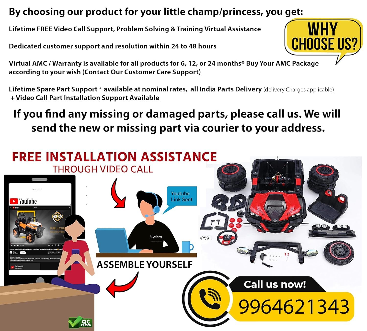 Technical Details :- 2 Battery ( 6v /4AH) VRLA Battery , 2Motor On Wheels + 1 Steering Motor (380) 12V/16000 RPM , MP3 & USB Interface Front & Back Rocking 2.4 GHz Remote Control Dual Color Tone Headlight & Power Display & Mobile App Based Control (Contact Customer Care Of The Car They Will Help You)