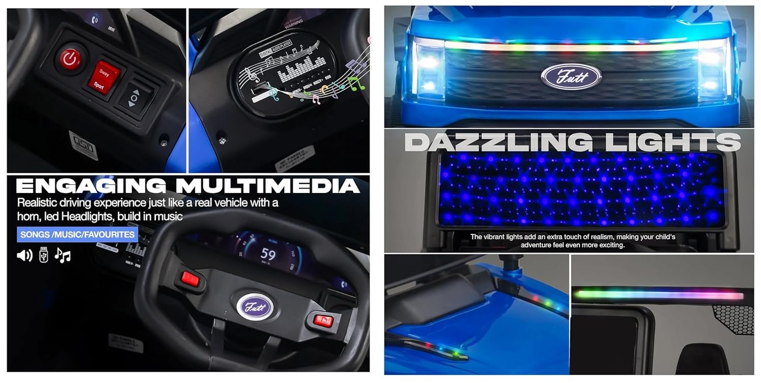 🚙 Realistic Car Design: Electric Car gives your kids a realistic driving experience just like a real vehicle with a horn, led Headlights, music, USB, Aux, and remote controller. You can connect a USB port or Aux and play a wider selection of songs and stories.