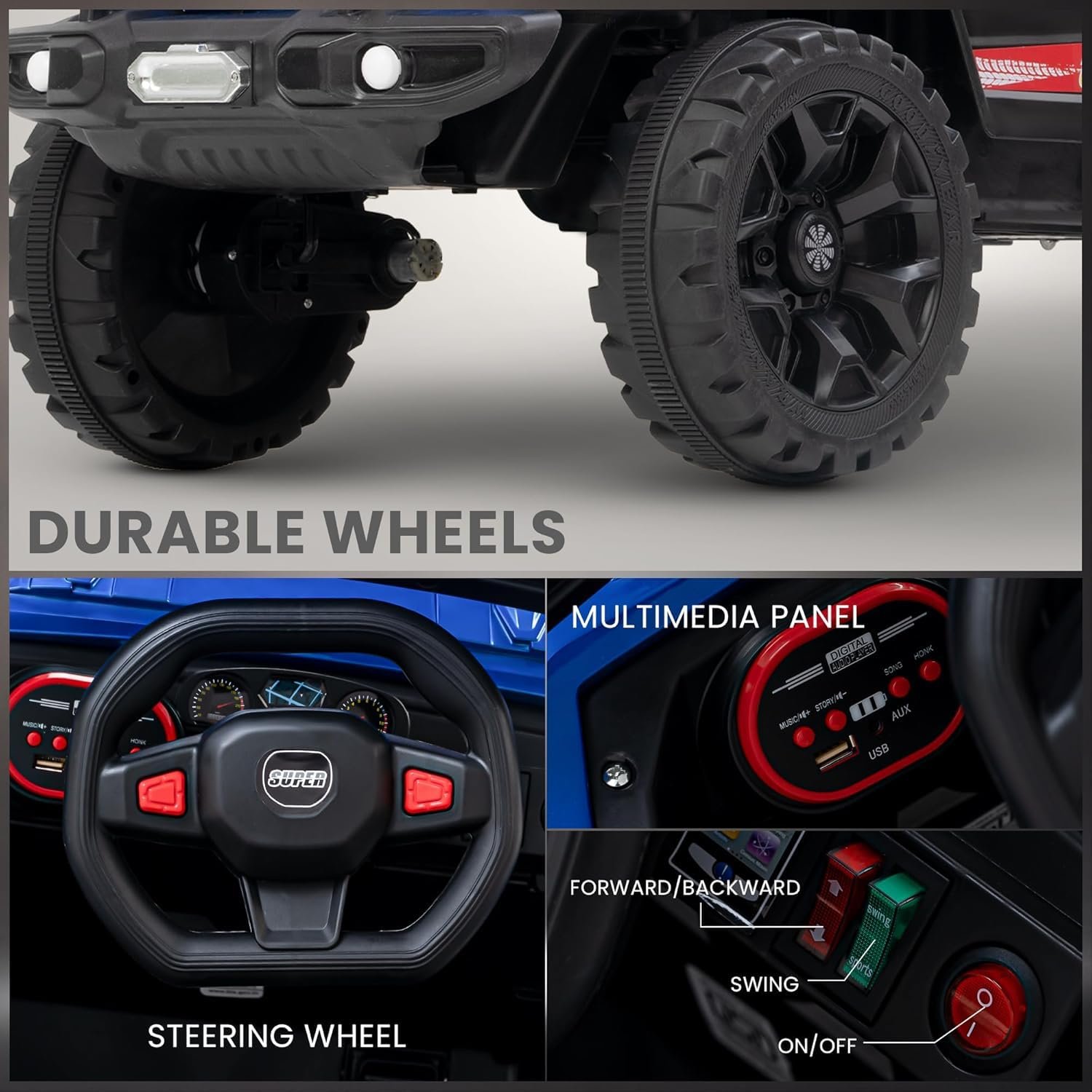 🚙 Realistic Car Design: Electric Car gives your kids a realistic driving experience just like a real vehicle with a horn, led Headlights, music, USB, Aux, and remote controller. You can connect a USB port or Aux and play a wider selection of songs and stories.