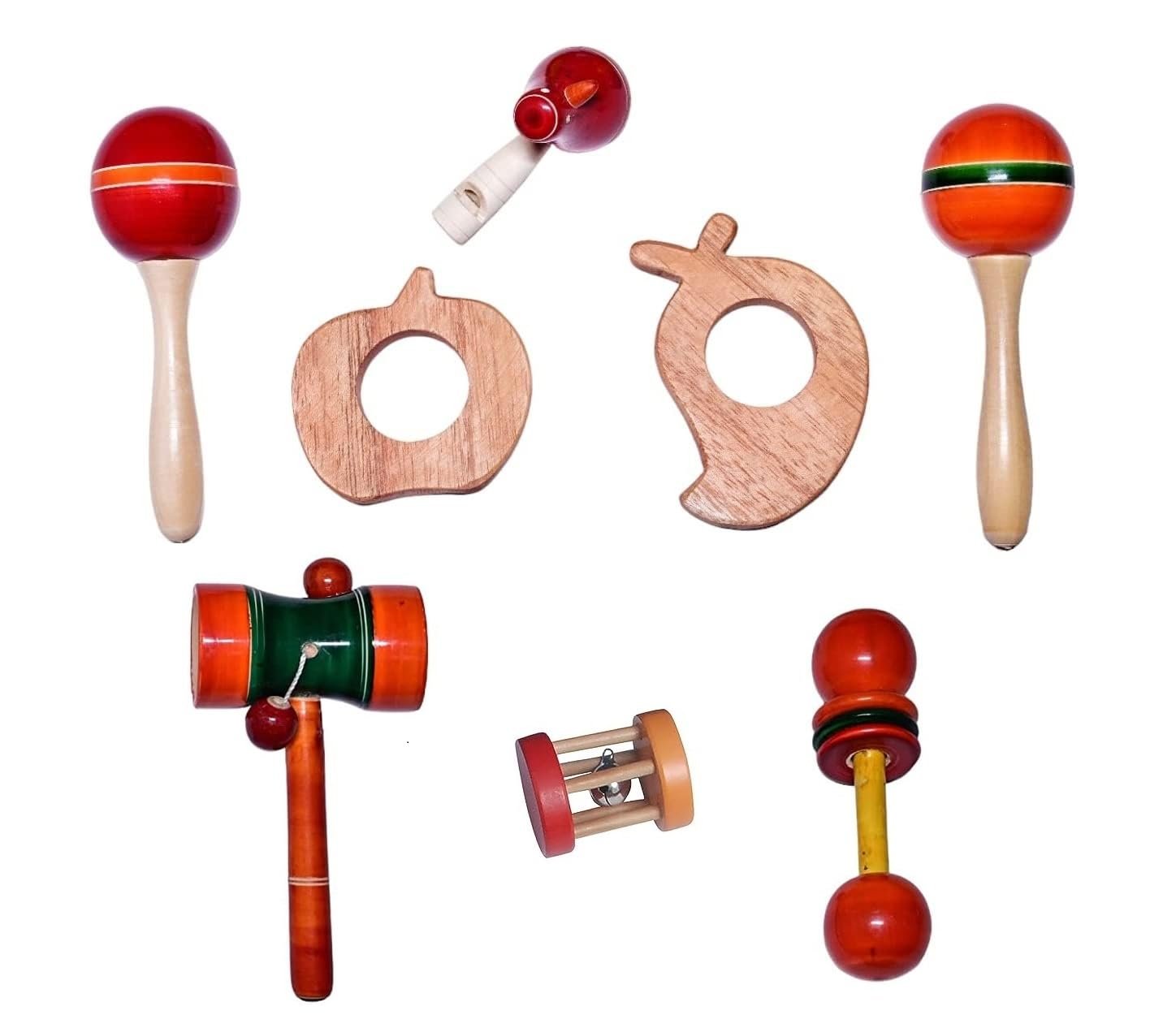 Wooden Montessori Maraca Rattles & Neem Wood Teethers, Bird Whistle Set of 8 – Colourful Musical Instrument Rattle Toy for Baby and Kids (0-3 Years) – Non-Toxic, Hold and Shake Toy