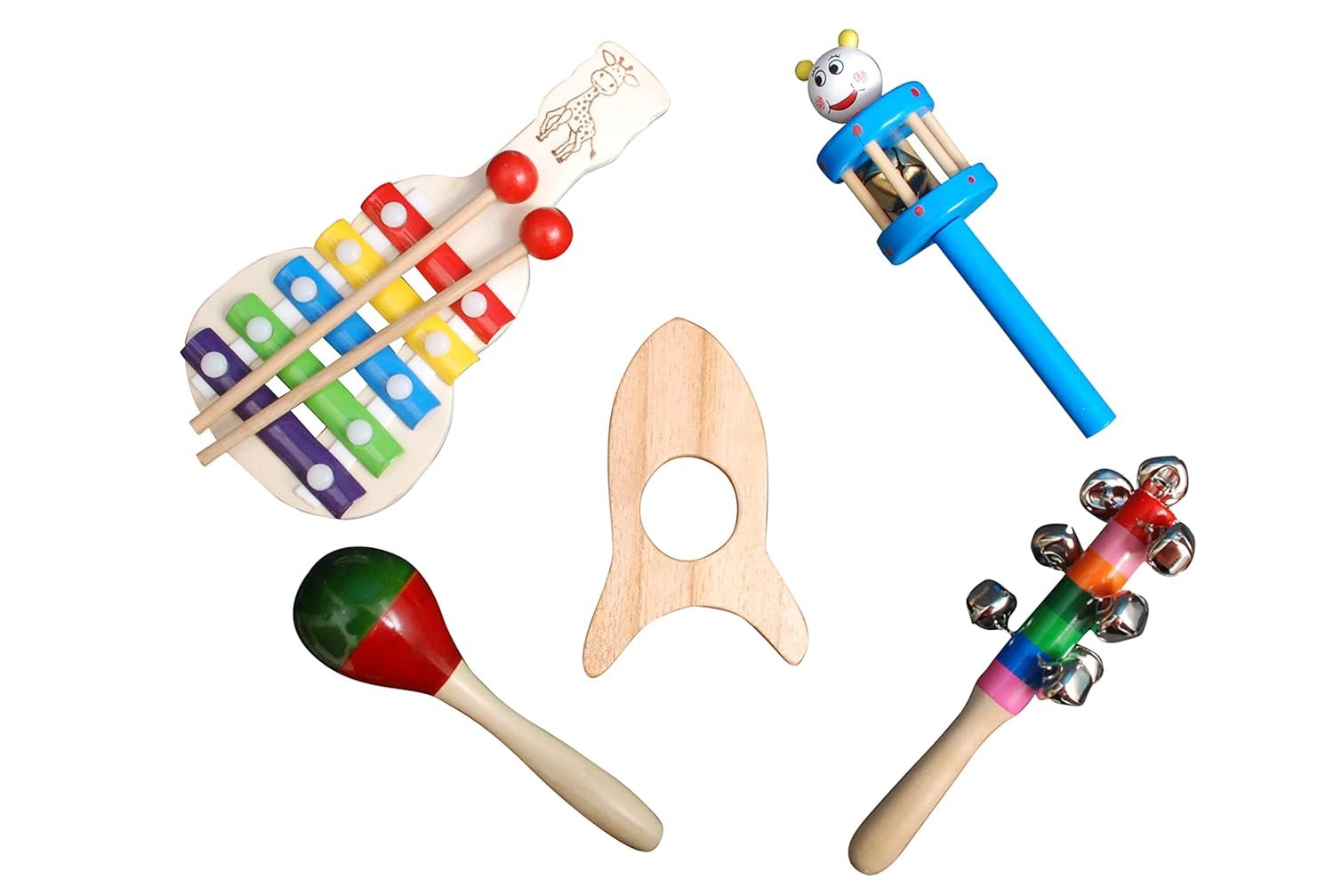Wooden Rattles & Teether for Baby, Infants, New Born Babies Toys (0 to 6 to 12 Months) – Set of 5 pcs – Non Toxic Multicolor – Made in India – Discover Sounds & Sensory Skills