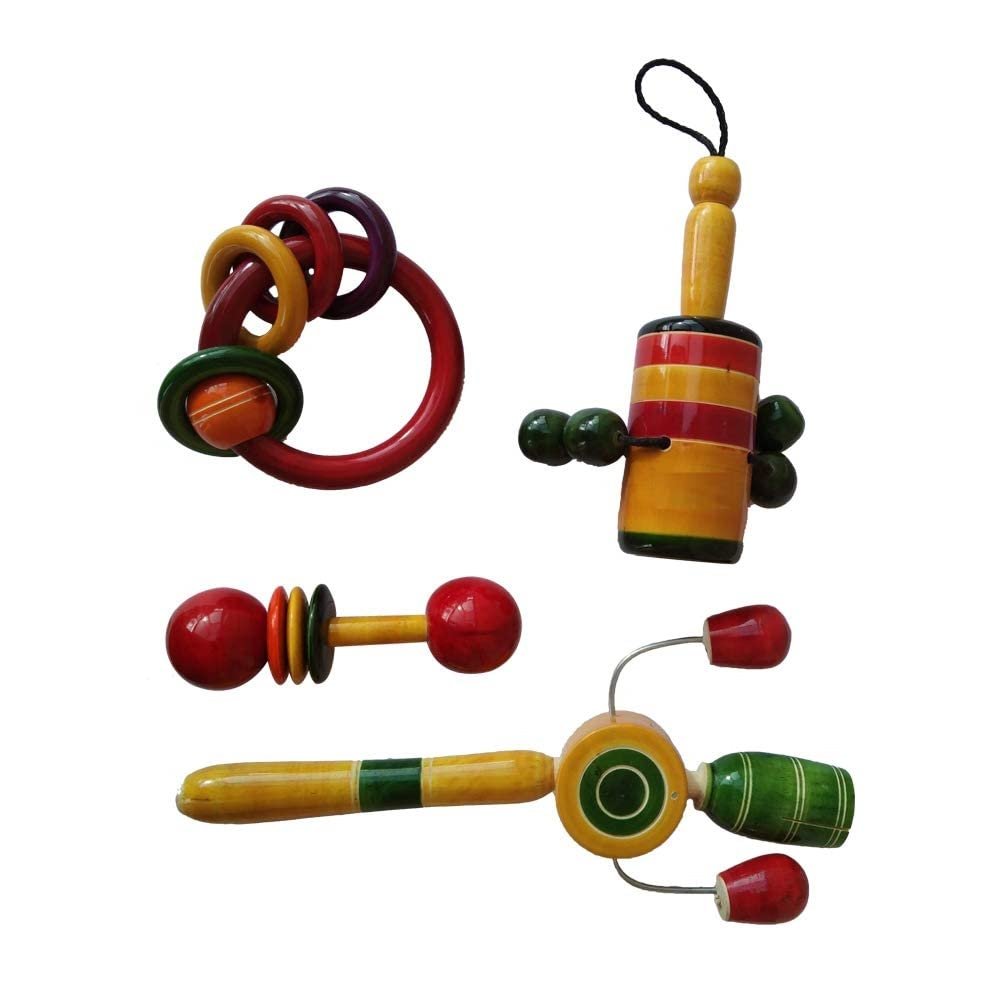 Wooden Rattles Toys for New-Born Babies, Infant Kids – Set of 4 pcs – Multicolor – Discover Sounds, Develops Sensory Skills
