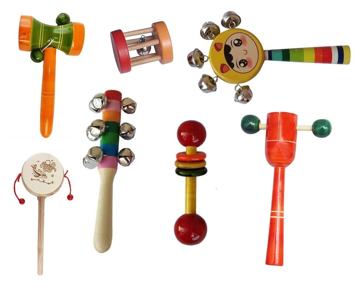 Wooden Toys Baby Rattles For 6 To 12 Months|Gift For New Born Baby Toys Girl Boy Infants 0 To 6 Months-Set Of 7 Pcs-Non Toxic Multi Colors-Develops Sensory Skills