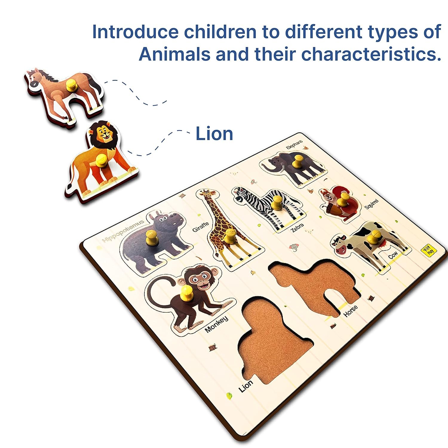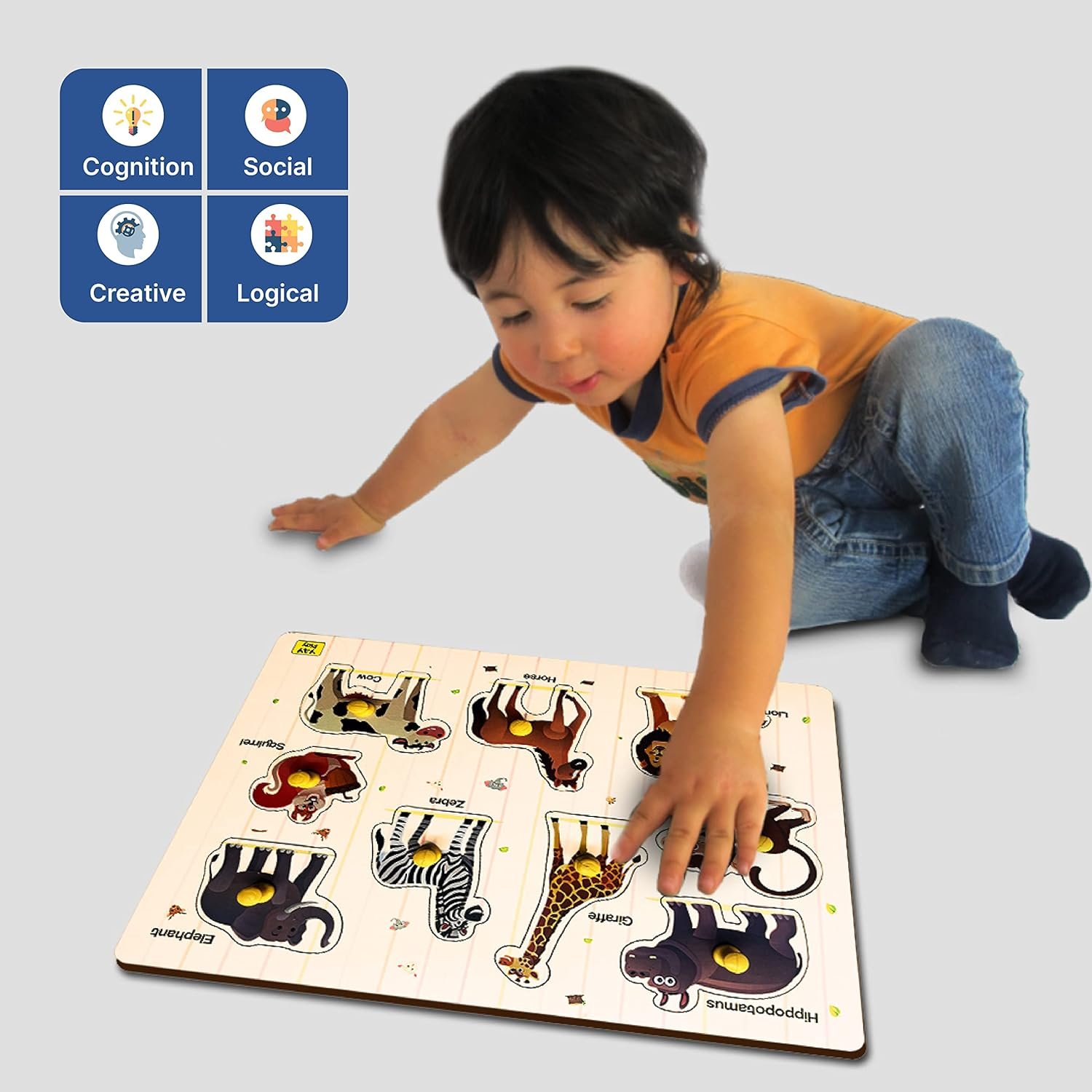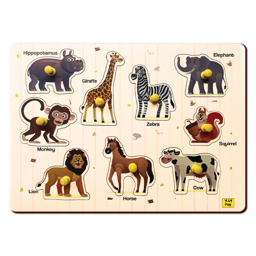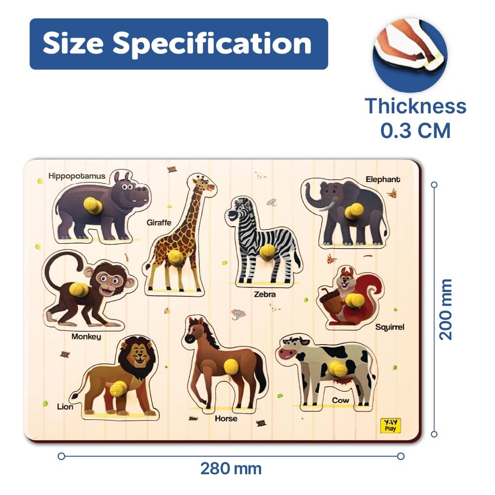 Yay Play Educational Toys for 3 Year Old – Wooden Animals Pegboard Knob Puzzle | Durable, Vivid Print Shape Puzzles for Kids for Age 2 | Easy to Grab 2 Years Kids Activity Toys